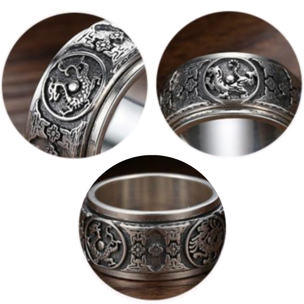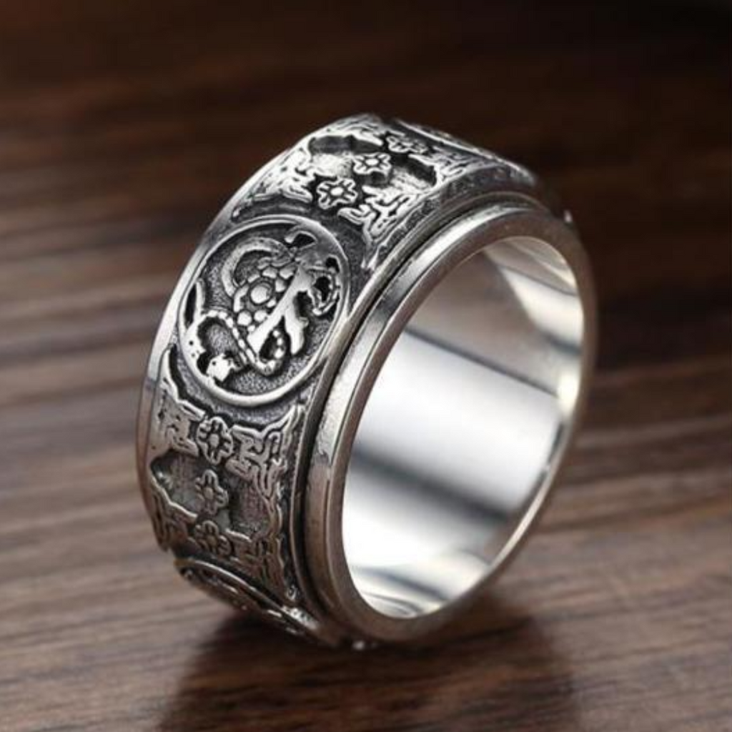 四神獣・四象が彫られているワイドフェイスな個性的なリング。