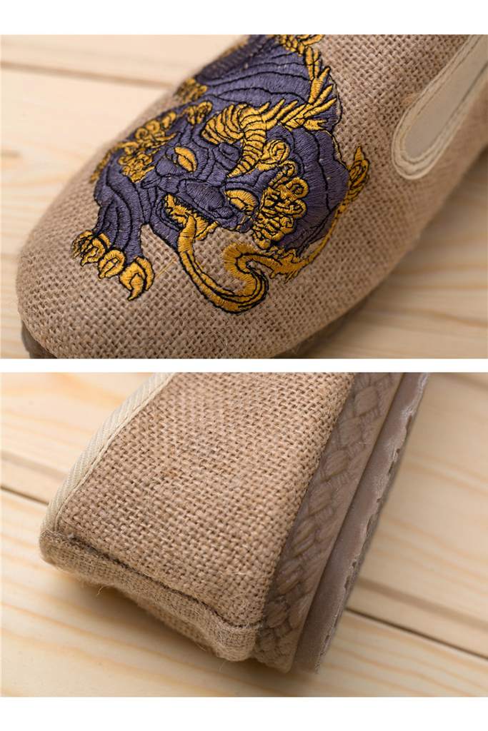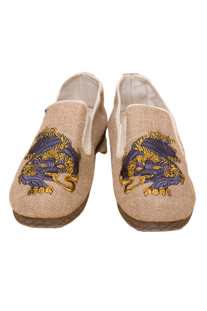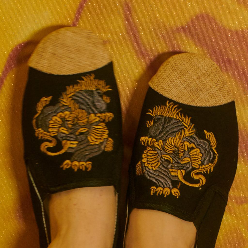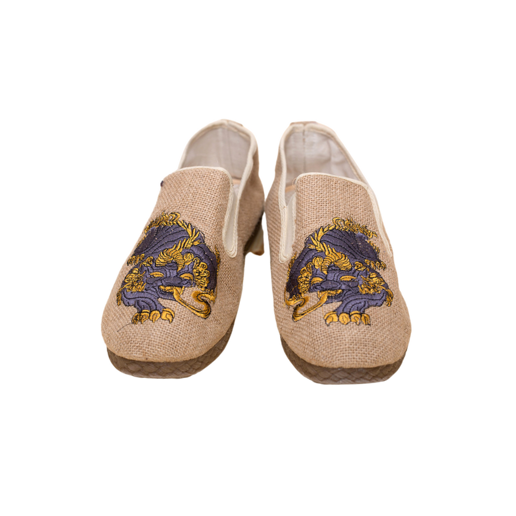 麒麟の刺繍が施されたキャンバス地仕立てチャイナシューズはレトロコーデにもってこいの一足。