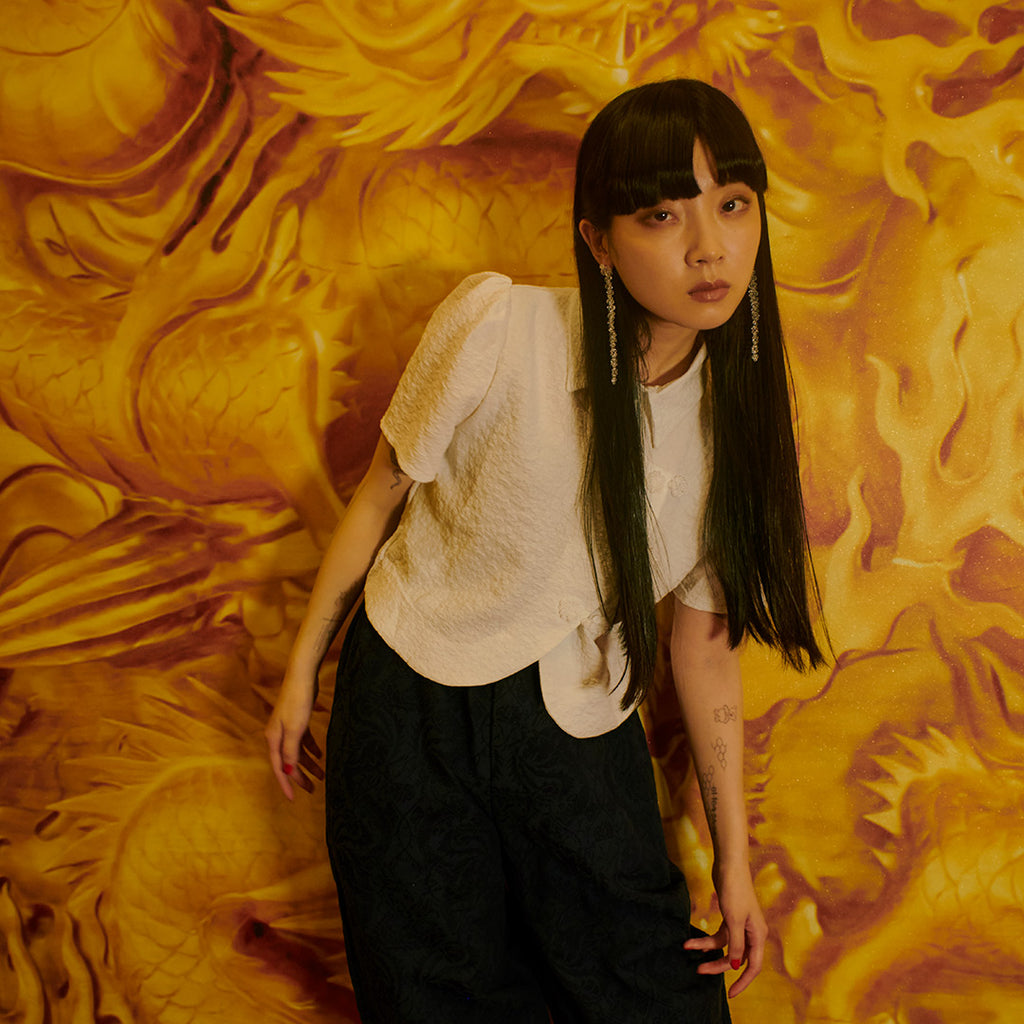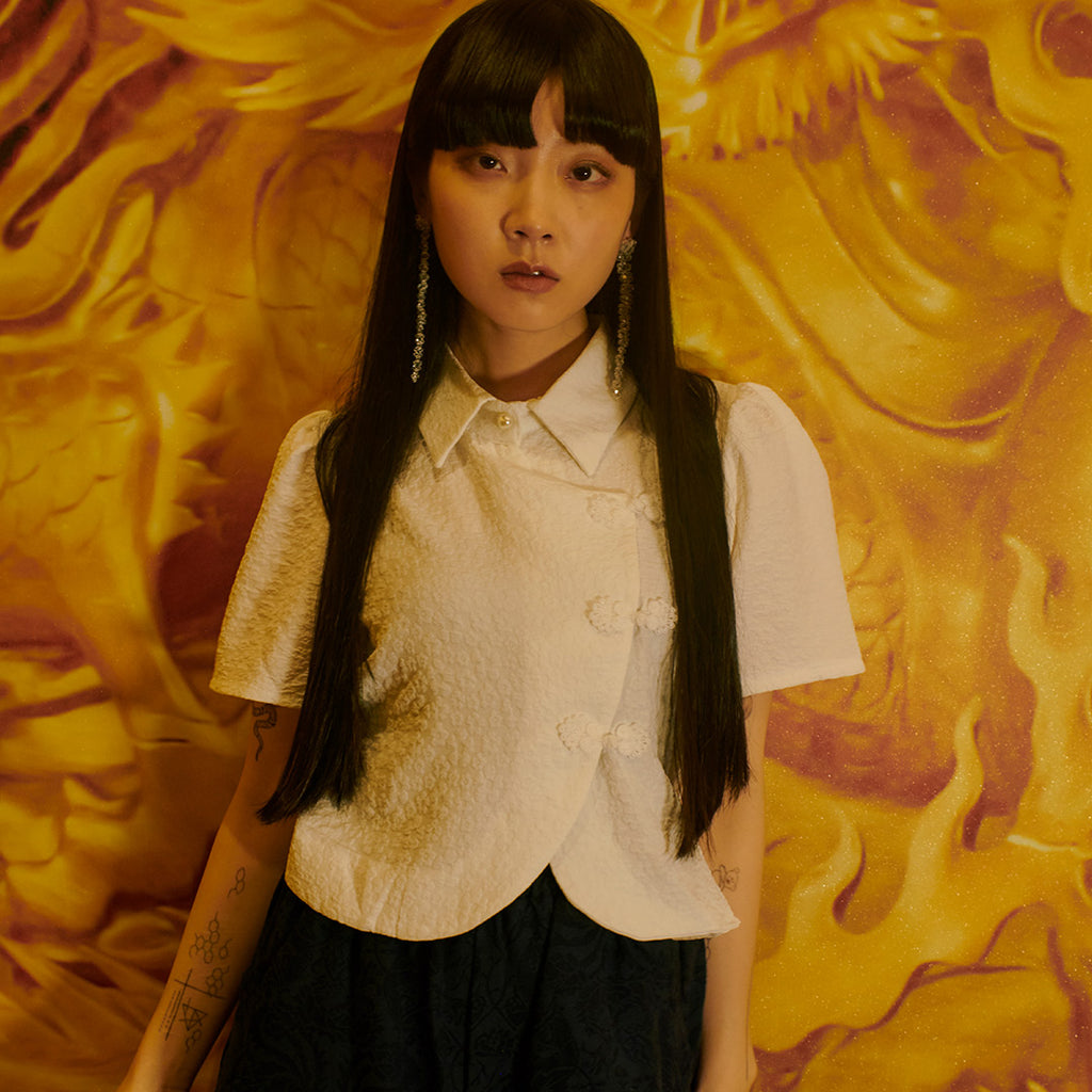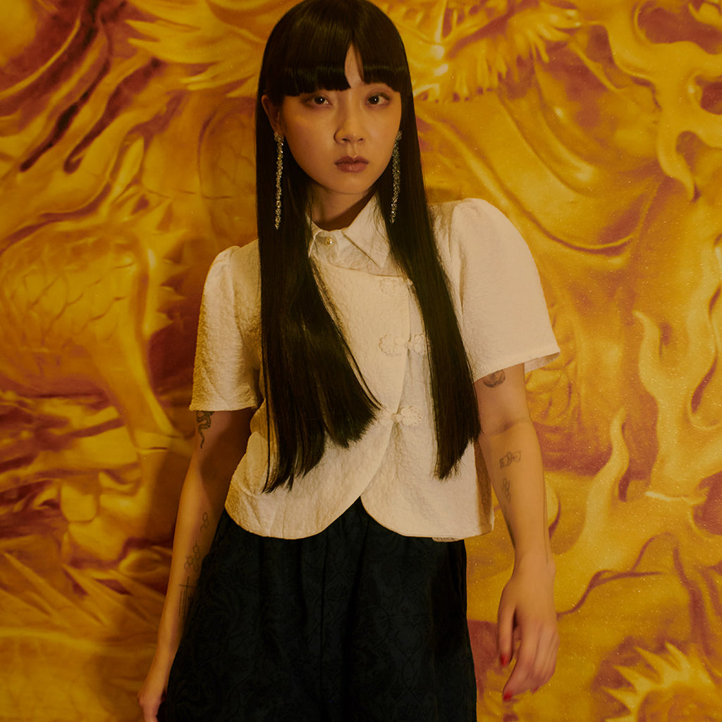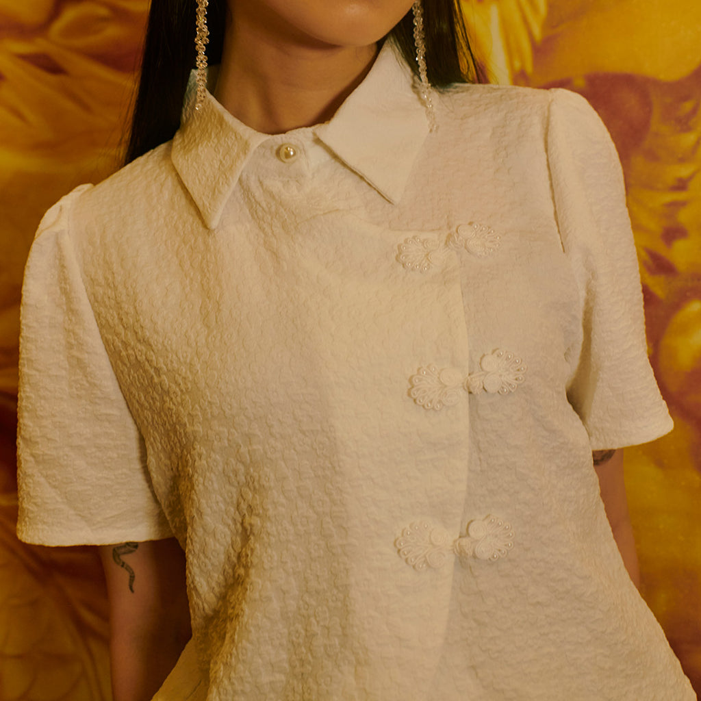 特徴的なスタンドカラー(立ち襟)やフロントのチャイナボタンに加え、クロップド丈のデザインが若々しくモダンな印象を与えます。