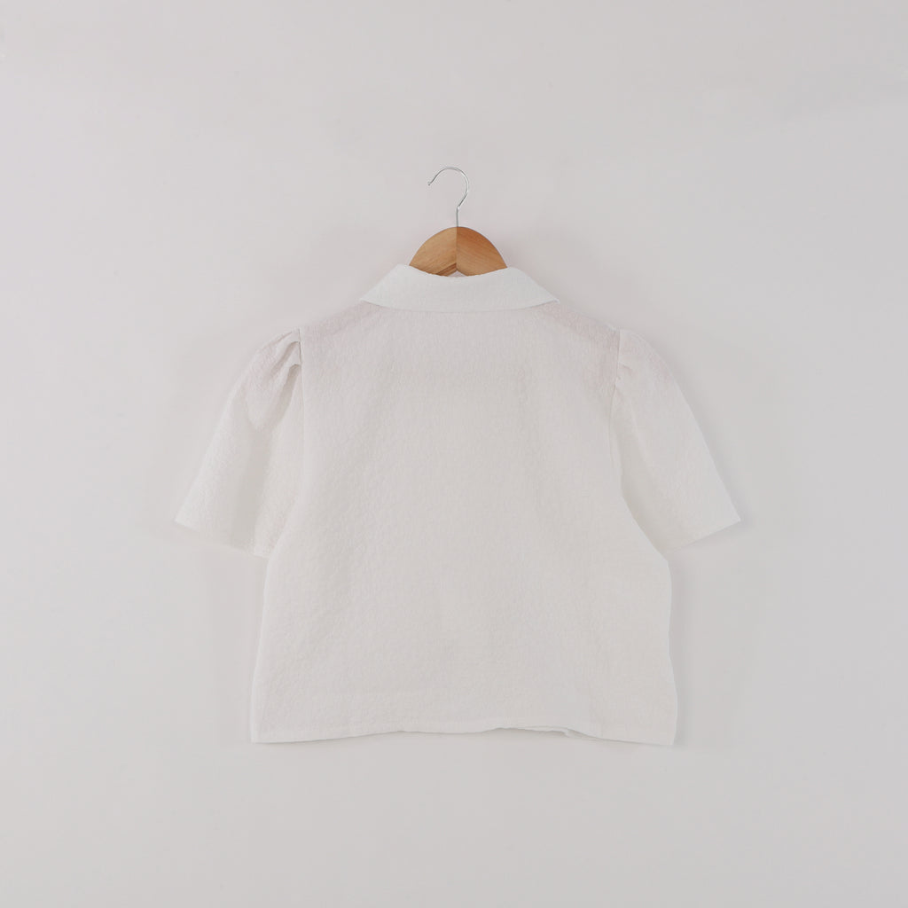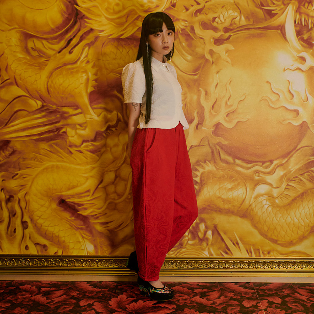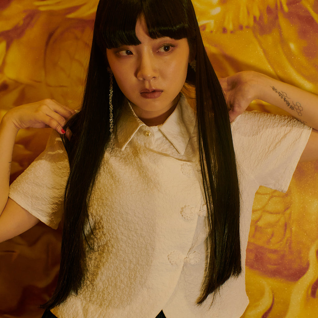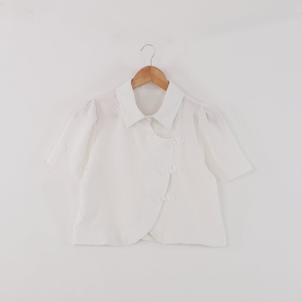 特徴的なスタンドカラー(立ち襟)やフロントのチャイナボタンに加え、クロップド丈のデザインが若々しくモダンな印象を与えます。