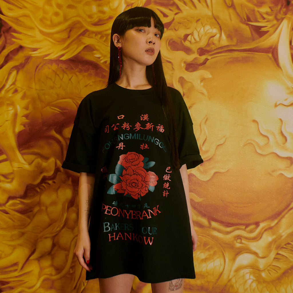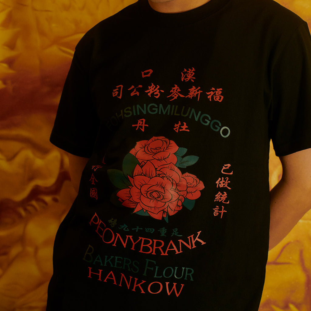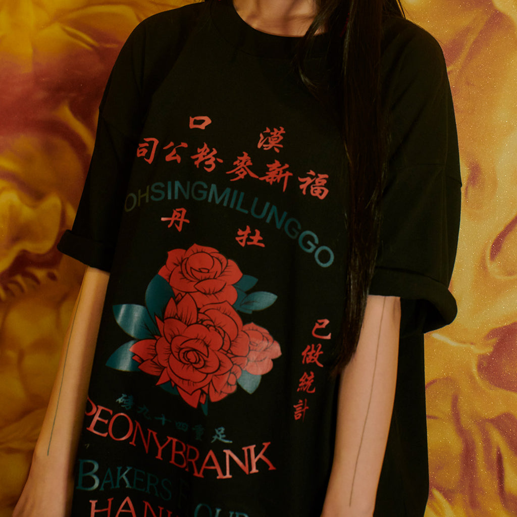 レトロな漢字と花柄グラフィックが特徴的なTシャツ。
